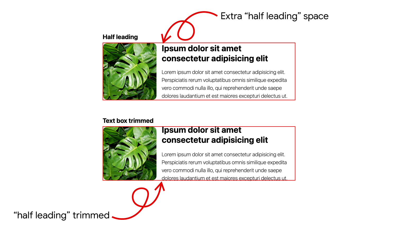 There are some much simpler centering and alignment solutions that emerge from this trim capability. You can even get closer to proper leading, where something like gap can be used between contents.