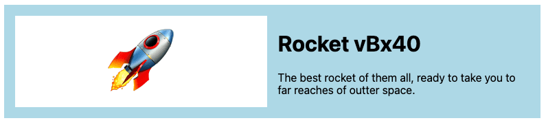 Sehen wir uns das erste Beispiel mit der Raketenkarte an. Was ist, wenn Sie eine Karte ohne Bild haben? Vielleicht möchten Sie den Titel vergrößern und das Rasterlayout auf eine Spalte anpassen, damit es ohne Bild besser aussieht.