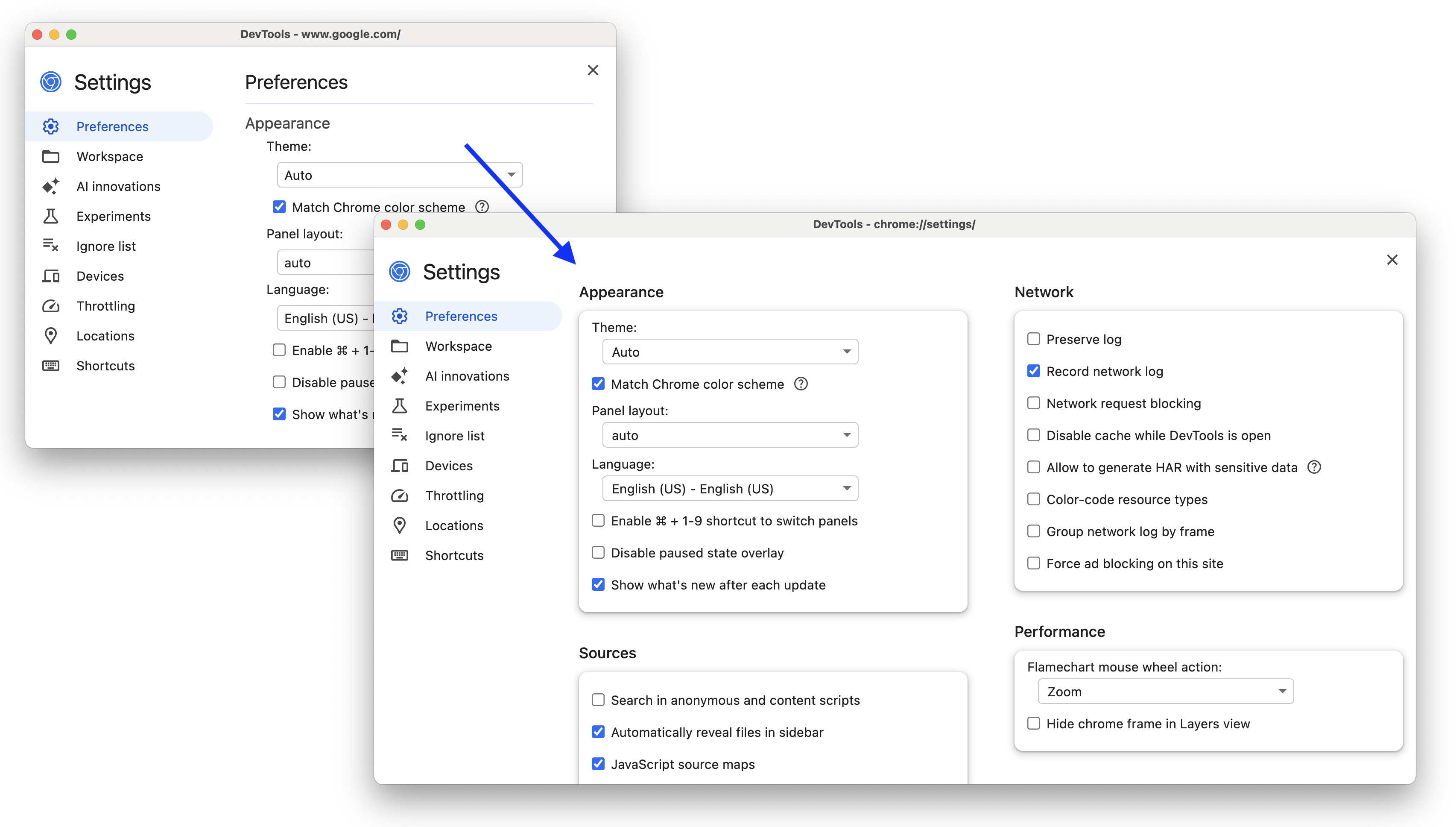 Um das Design der Benutzeroberfläche besser anzugleichen, sehen die Einstellungen der Entwicklertools jetzt den Chrome-Einstellungen ähnlicher. Insbesondere sind die Abschnitte jetzt visuell in „Karten“ unterteilt.