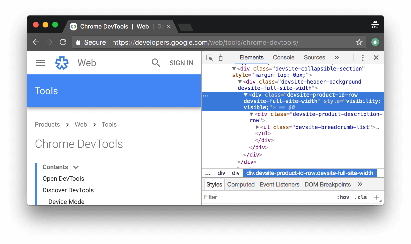 Toolsटेक्स्ट शामिल है. ध्यान दें कि यह नोड, एलिमेंट पैनल के डीओएम ट्री में पहले से ही चुना गया हैकमांड मेन्यू खोलें.
