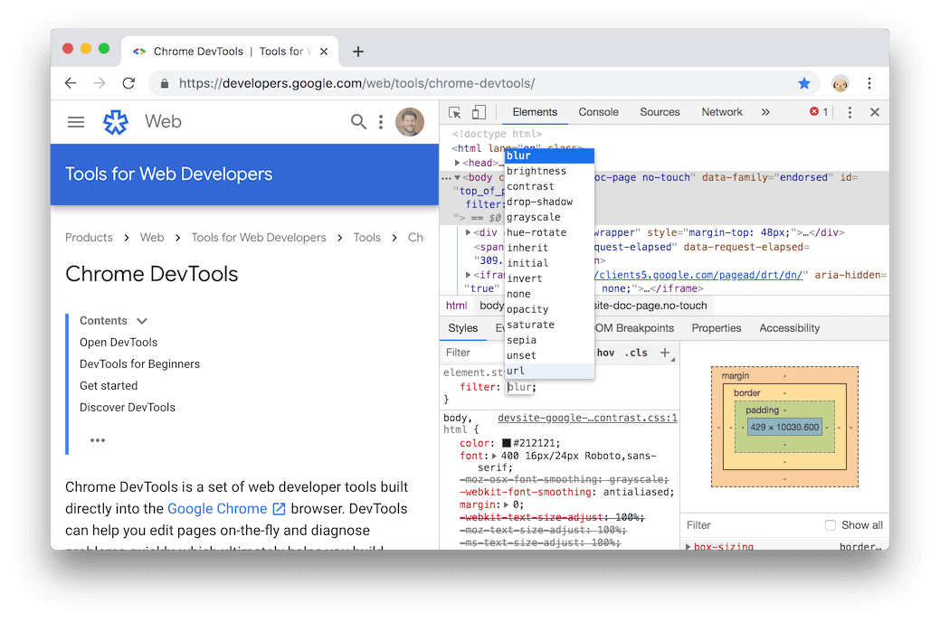 aggiunge una sfocatura di 1 pixel a un nodo. Quando completi automaticamente le proprietà come filter, DevTools ora compila