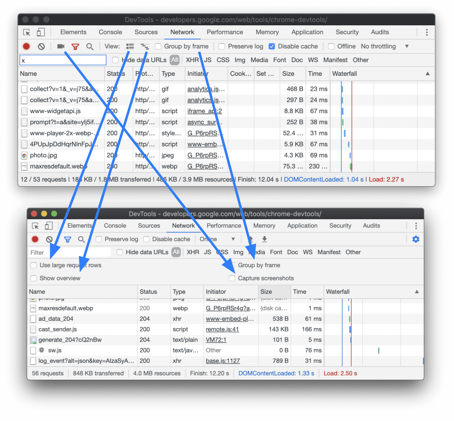 Het Netwerkpaneel had voorheen een probleem met de bruikbaarheid, waarbij opties zoals het menu voor het beperken van de bandbreedte onbereikbaar waren wanneer het DevTools-venster smal was. Om dit probleem op te lossen en het Netwerkpaneel overzichtelijker te maken, zijn een paar minder gebruikte opties verplaatst naar de nieuwe Netwerkinstellingen.