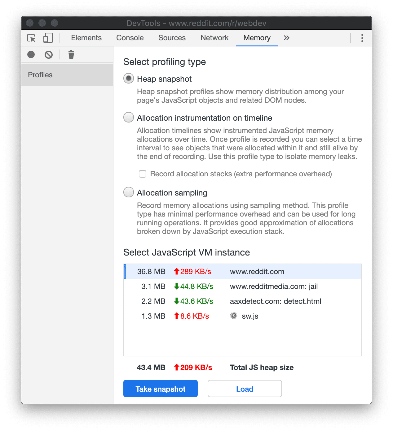 Figuur 5. Onderaan het paneel Geheugen ziet u dat de pagina in totaal 43,4 MB geheugen gebruikt. 209 KB/s geeft aan dat het totale geheugengebruik met 209 KB per seconde toeneemt.