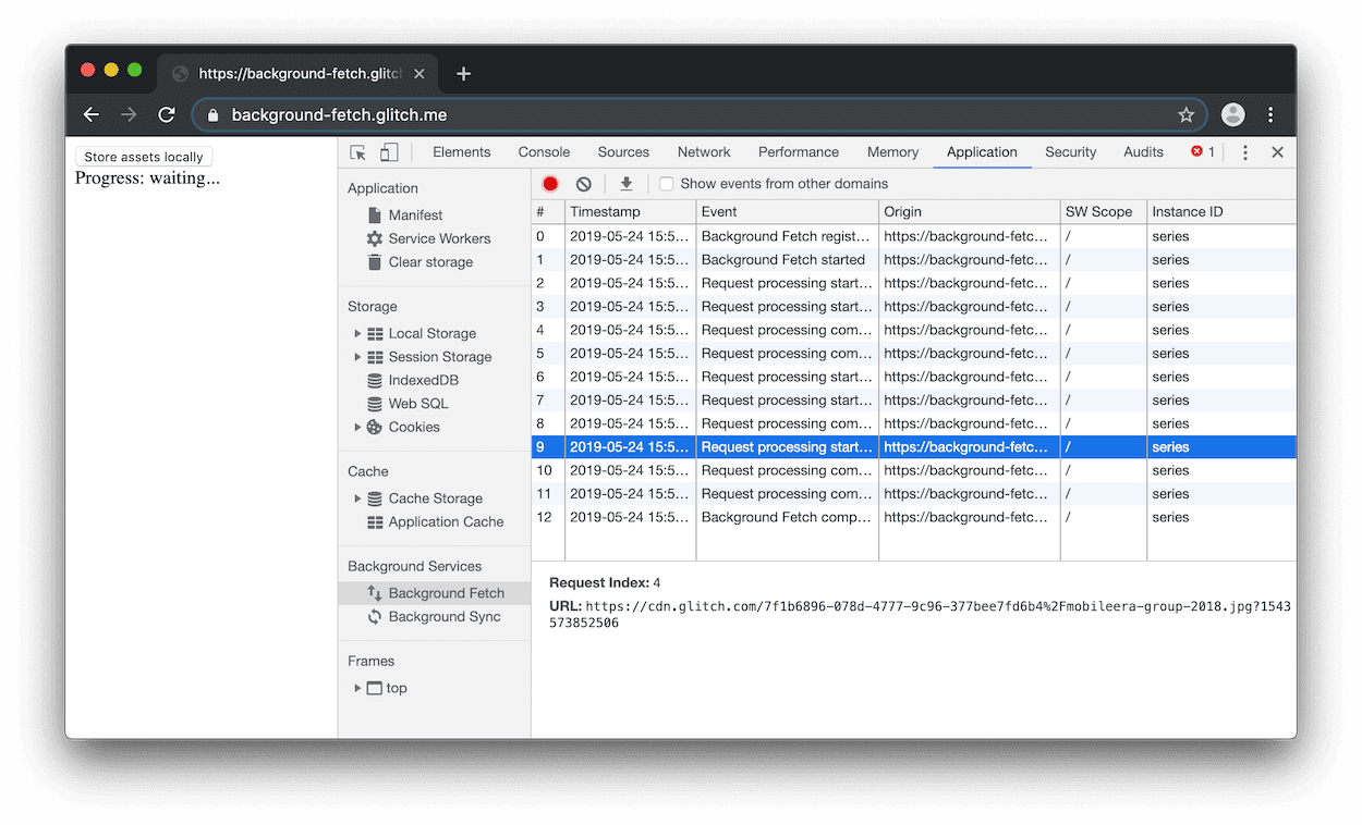 Use a nova seção Serviços em segundo plano do painel Aplicativo para monitorar eventos de busca em segundo plano e sincronização em segundo plano. Como os eventos de busca e sincronização em segundo plano ocorrem em segundo plano, não seria muito útil se o DevTools registrasse apenas esses eventos enquanto estivesse aberto. Assim, depois que você começar a gravar, os eventos de busca e sincronização em segundo plano vão continuar sendo registrados, mesmo depois que você fechar a guia e o Chrome.