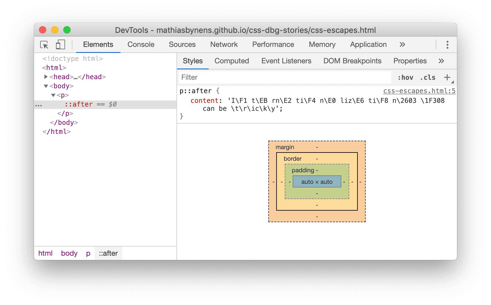 على سبيل المثال، في هذا العرض التوضيحي، عند فحص العنصر الزائف p::after، يظهر لك سلسلة محوَّلة في لوحة "الأنماط":