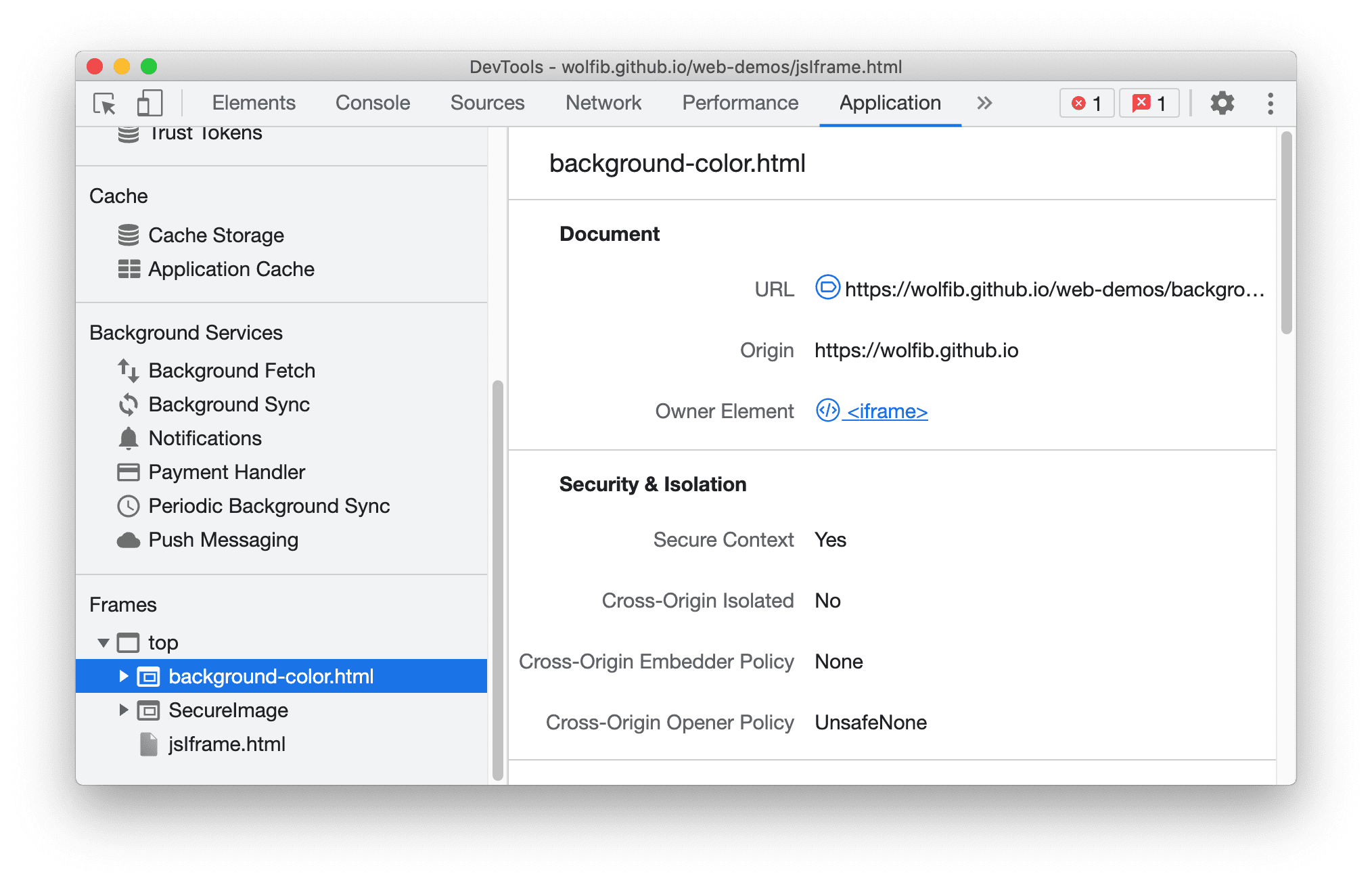 Isso leva você a uma visualização dos detalhes do iframe no painel "Application ", onde é possível examinar detalhes do documento, status de segurança e isolamento, política de permissões e muito mais para depurar possíveis problemas.