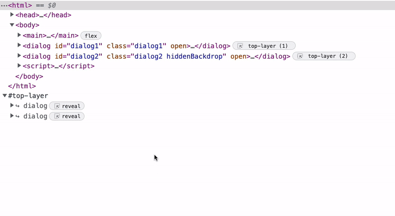 اگر عنصر اضافه شده اولین عنصر در لایه بالایی نباشد، تابعی که هنگام قرار دادن عنصر در لایه بالایی فراخوانی می شود، یک کلاس hiddenBackdrop را به ::backdrop اعمال می کند. این کلاس زمانی حذف می شود که عنصر از لایه بالایی حذف شود.