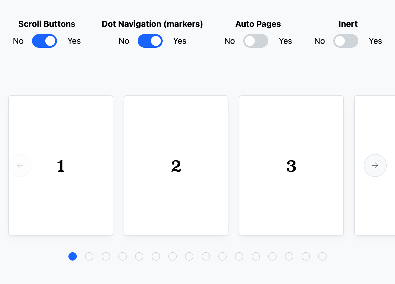 Ein Builder, mit dem sich die Funktionen eines reinen CSS-Karussells visualisieren lassen: Schaltflächen, Markierungen, Seitenwechsel und Inertie.
