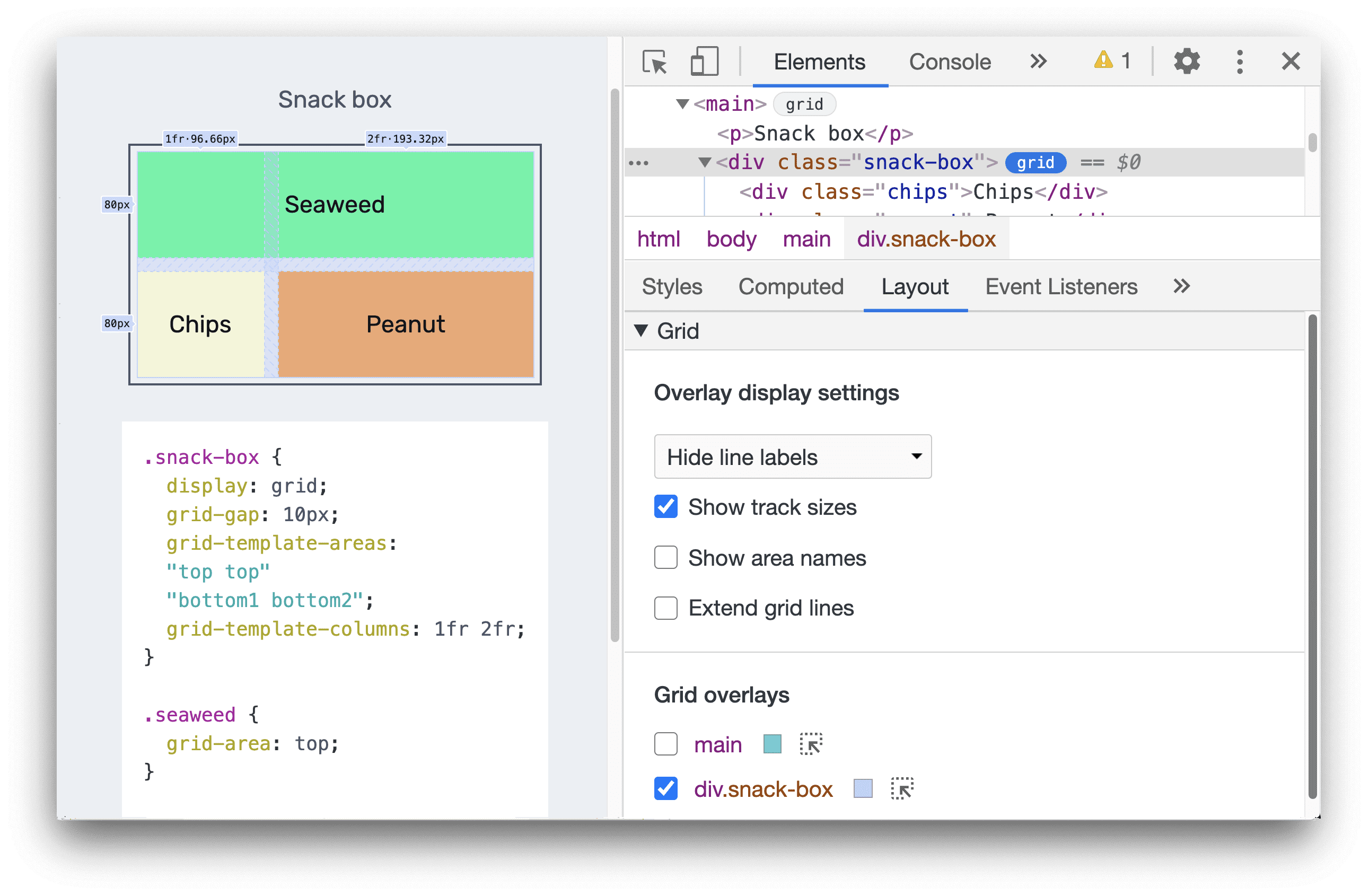 इस डेमो में, snack-box कॉलम के साइज़ को सीएसएस grid-template-columns:1fr 2fr; में तय किया गया है. इसलिए, कॉलम लाइन लेबल में, एडिट किए गए और कैलकुलेट किए गए साइज़, दोनों दिखते हैं: 1fr - 96.66px और 2fr - 193.32px.