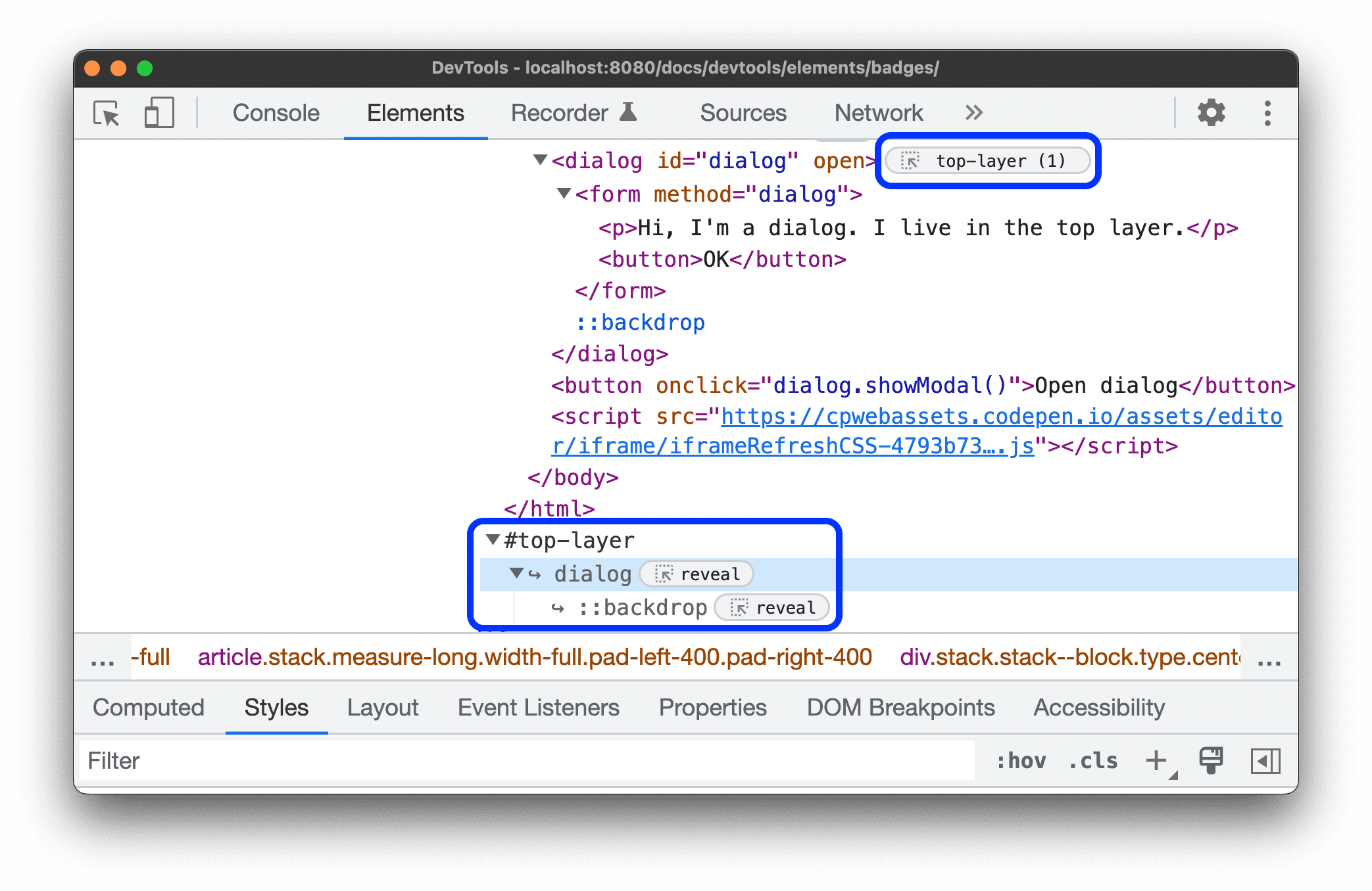 <dialog>एलिमेंट के बगल में मौजूदtop-layer (1)बैज पर क्लिक करें. एलिमेंट पैनल, आपको क्लोज़िंग</html>टैग के बाद#top-layerकंटेनर में उससे जुड़े एलिमेंट पर ले जाता है.