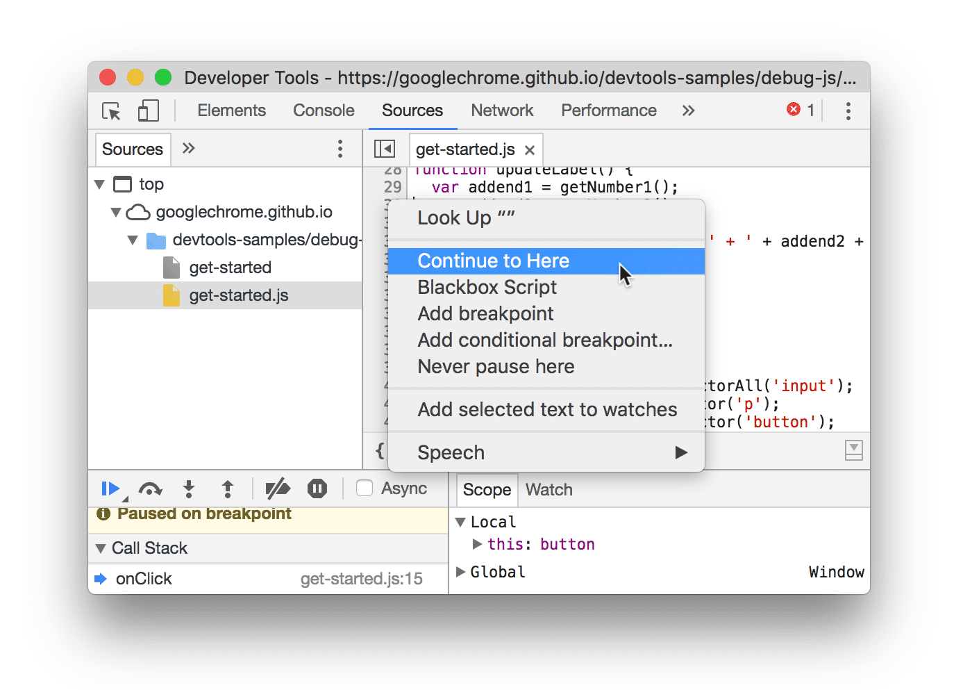 Klicken Sie mit der rechten Maustaste auf die gewünschte Codezeile und wählen Sie Continue to here (Bis hierher fortfahren) aus. DevTools führt den gesamten Code bis zu diesem Punkt aus und pausiert dann in dieser Zeile.