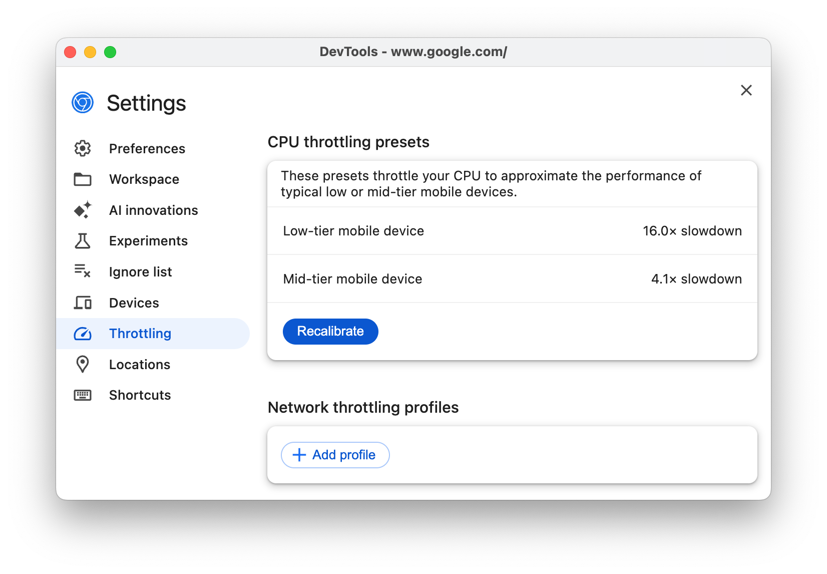 Tab Throttling akan menampilkan kecepatan throttling CPU yang dapat Anda terapkan ke perangkat untuk mendapatkan gambaran tentang performa halaman Anda di perangkat seluler kelas bawah dan menengah.