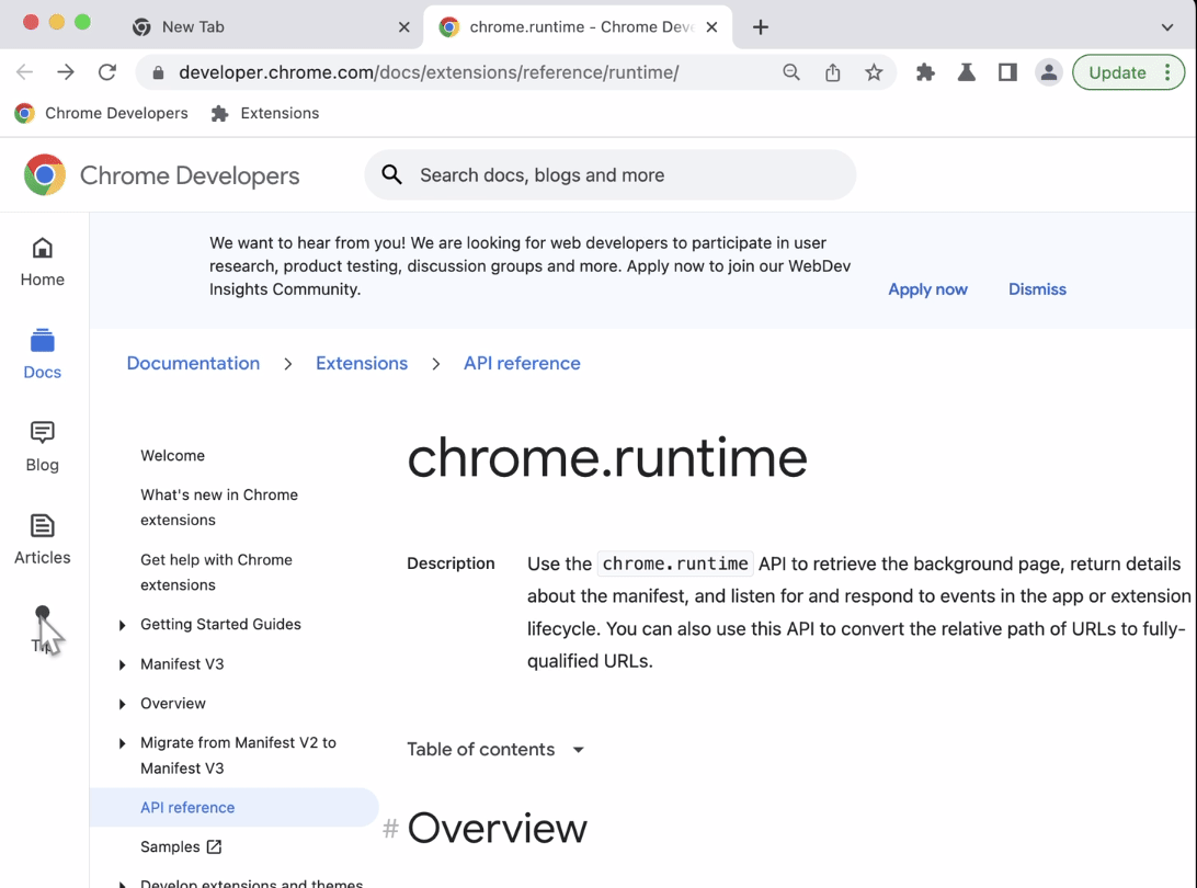 - Eine neue Seite mit der Chrome API-Referenz wird geöffnet.